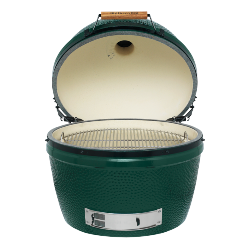 Das Big Green Egg 2XL ist der größte am Markt erhältliche Kamado. Mithilfe des Nests kann er dennoch verschoben werden. Der Scharniermechanismus hilft dabei, selbst einen so großen Deckel noch bequem öffnen zu können.
