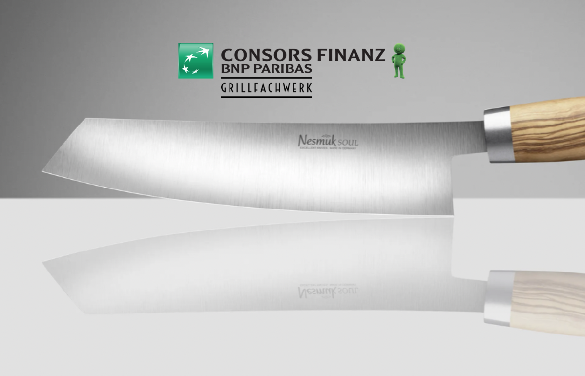 Mit Consors Finanz bei Grillfachwerk kannst Du jetzt sämtliche Messer von Nesmuk ganz einfach und flexibel finanzieren. Gemeinsam mit Consors Finanz bieten wir Dir die Möglichkeit, Dein neues Premium-Messer bequem in transparenten Monatsraten zu bezahlen.