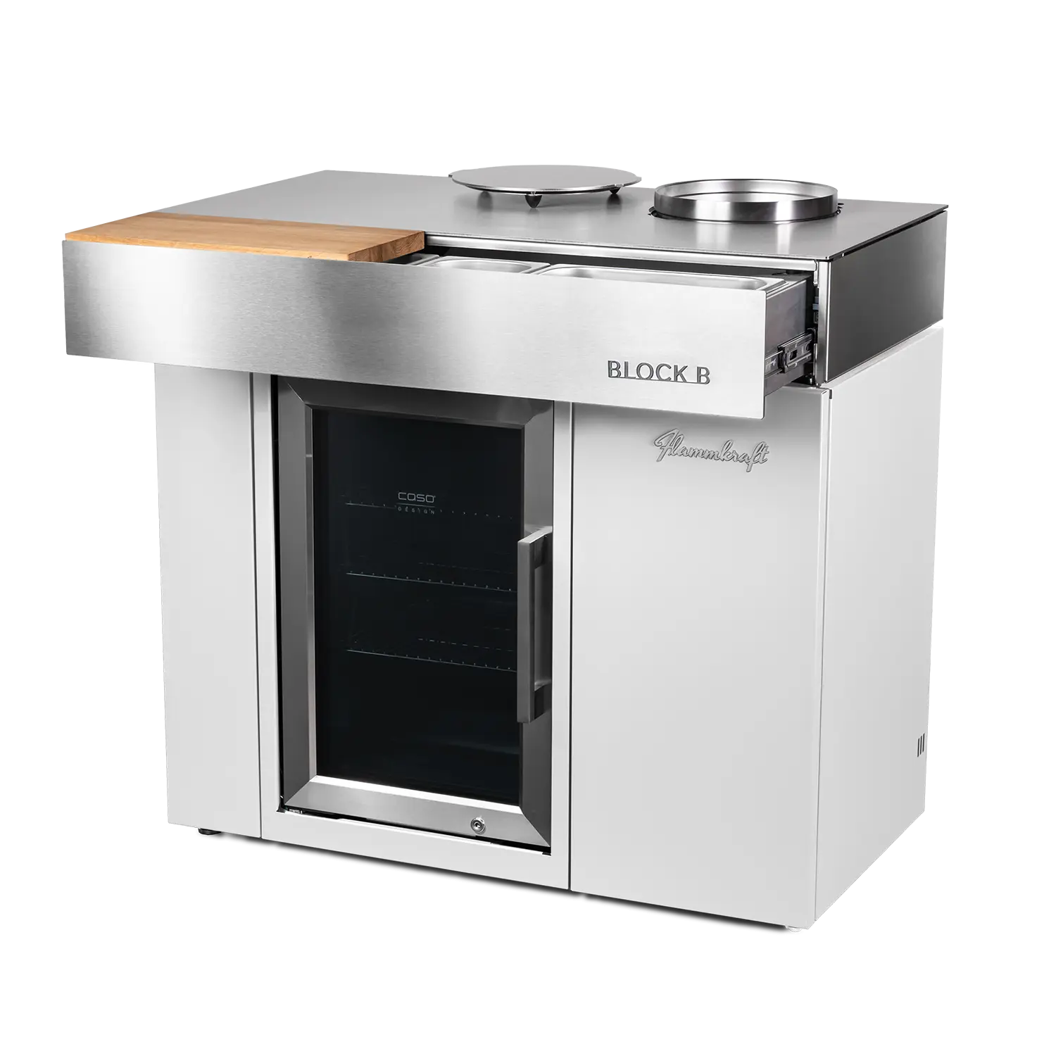 Der Block B besitzt außerdem ein Flaschenlager und Stauraum im Unterbau, eine isolierte Schublade mit Edelstahlbehältern und integriert ein Schneid- und Servierbrett aus Eiche.
