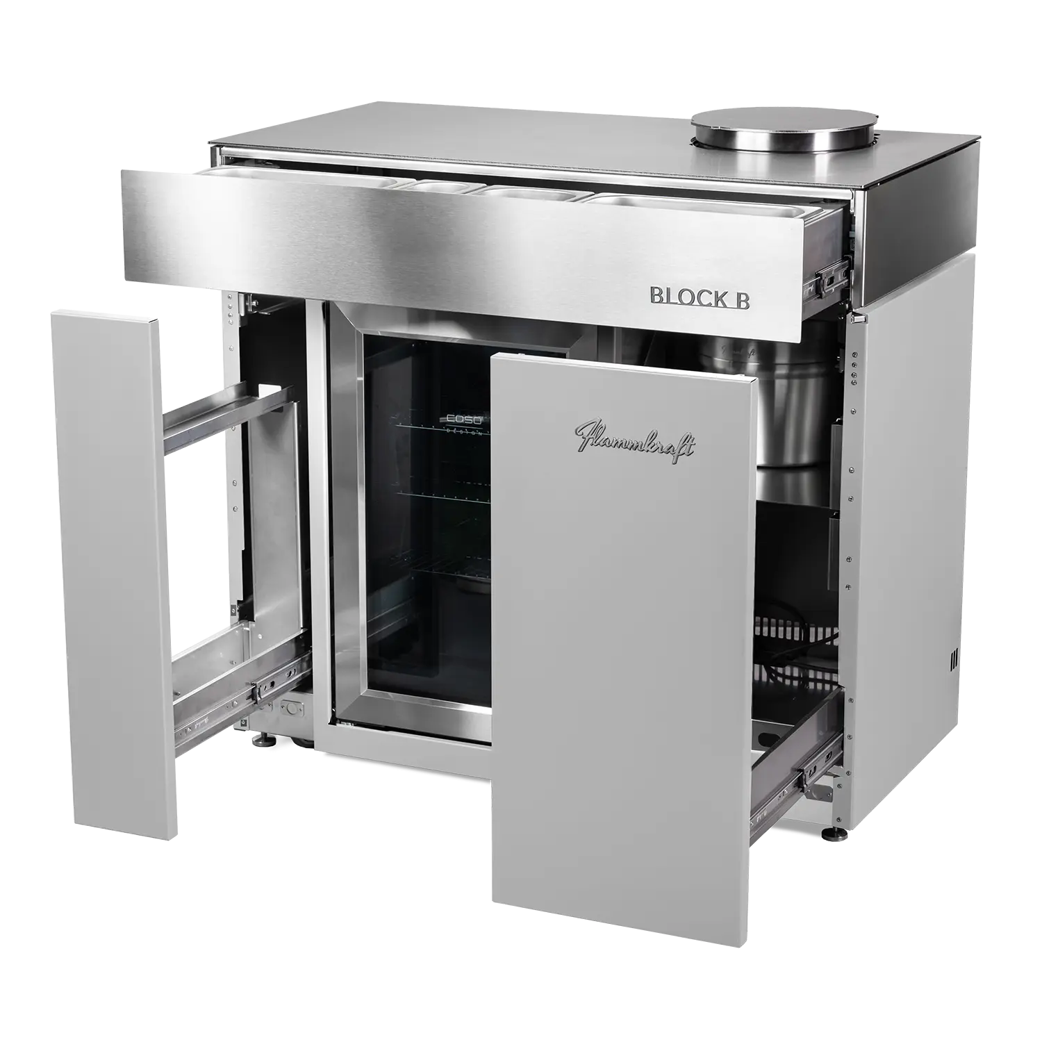Mit seinem hochwertigem Design bietet der Block B außerdem einen Vakuumisolierten Eis-Eimer aus Edelstahl, einen Stauraum für Flaschen und Zubehör, eine isolierte Schublade mit vier Edelstahl-Behältern und vieles mehr.