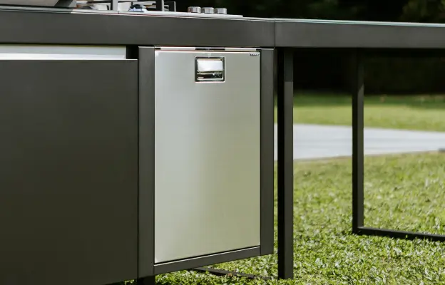 Kühl- und Gefrierschrank von Vitrifrigio mit einer Edelstahlfront. Direkt im Unterschrank der Agher eingebaut.
