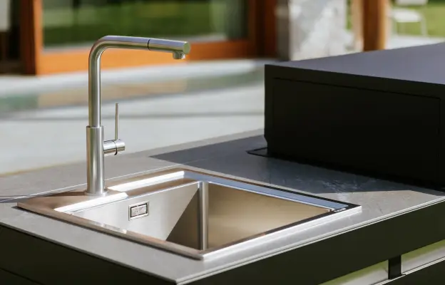 Die Spüle fügt sich perfekt in die Arbeitsplatte ein und ist mit einer Mischbatterie und Handbrause ausgestattet.