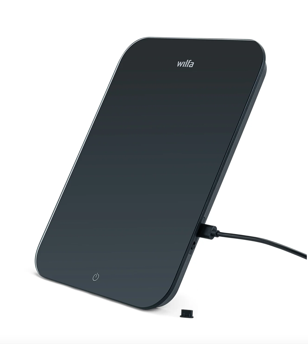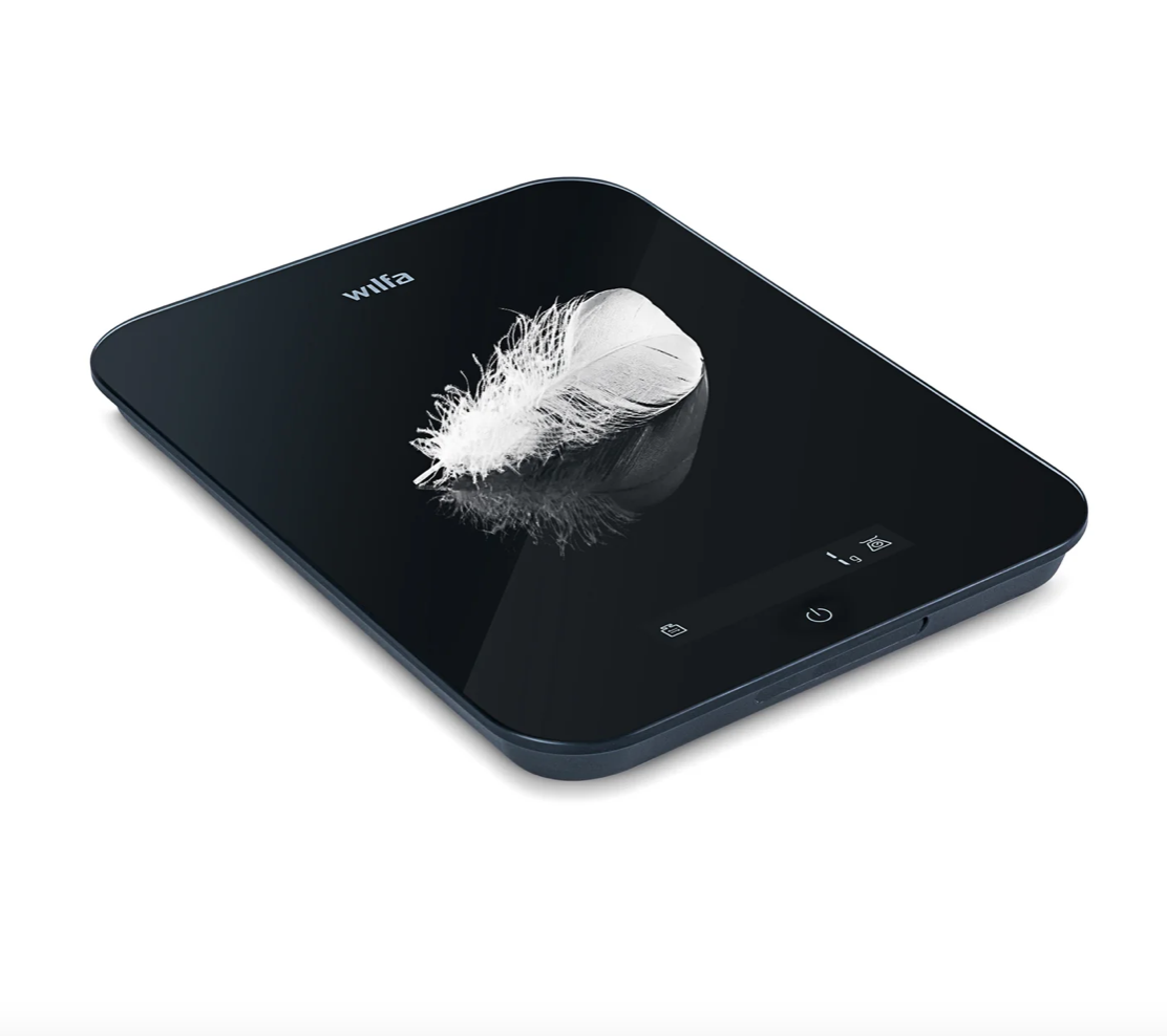 Die Wilfa Max Waage besitzt ein hohes Fassungsvermögen von 1g bis hin zu 10kg und lässt sich mit USB-C aufladen.