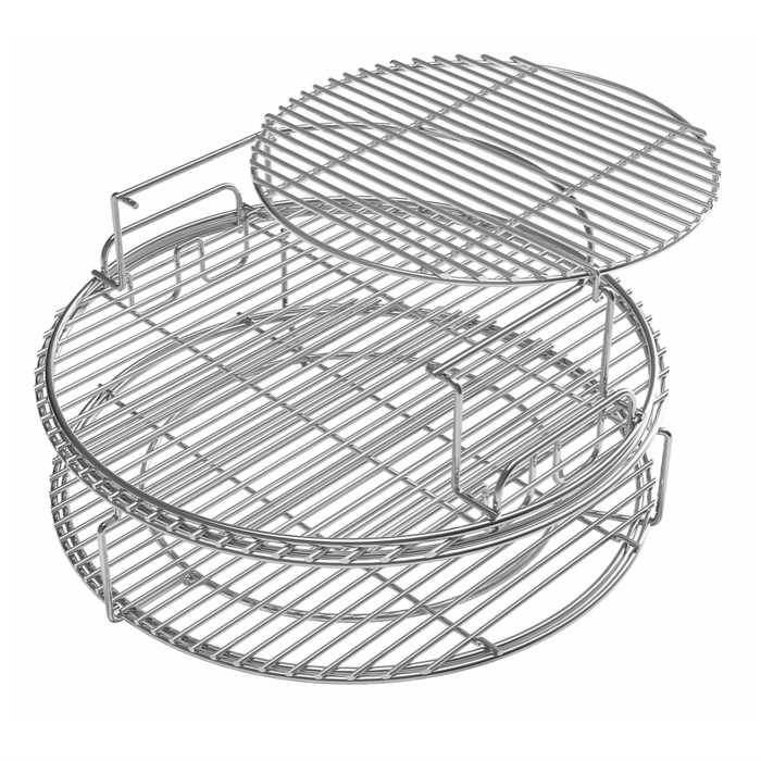 Die beiden halbrunden Edelstahlroste sind perfekt zum Grillen oder Backen. Dabei lassen sie genug Platz um viele weitere Platten und Roste wie Gussgrillrost, Pizzasteine oder Grillplatten in den EGGspander einzulegen.