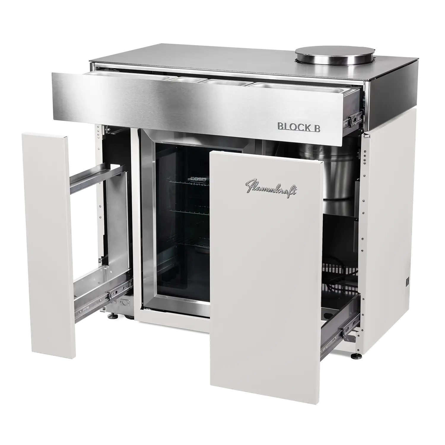 Mit seinem hochwertigem Design bietet der Block B außerdem einen Vakuumisolierten Eis-Eimer aus Edelstahl, einen Stauraum für Flaschen und Zubehör, eine isolierte Schublade mit vier Edelstahl-Behältern und vieles mehr.