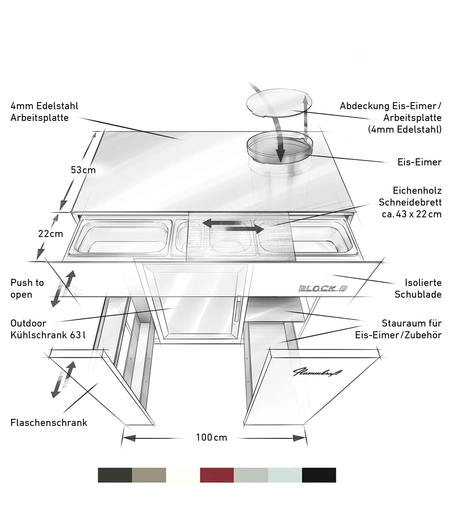 Der Block B besitzt außerdem ein Flaschenlager und Stauraum im Unterbau, eine isolierte Schublade mit Edelstahlbehältern und integriert ein Schneid- und Servierbrett aus Eiche.