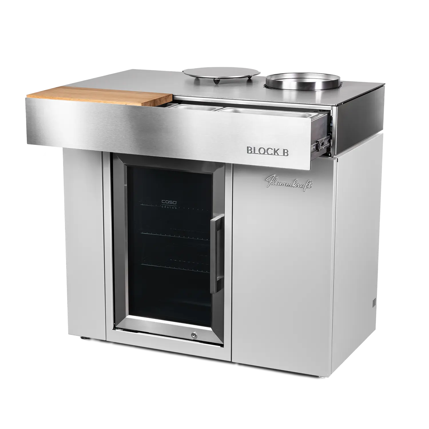 Der Block B besitzt außerdem ein Flaschenlager und Stauraum im Unterbau, eine isolierte Schublade mit Edelstahlbehältern und integriert ein Schneid- und Servierbrett aus Eiche.