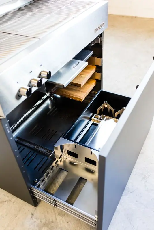 Die beiden entnehmbaren Edelstahlschubladen bilden die Basis des Ofendocks. Die darüber liegenden Roste sind einzeln einklappbar.
