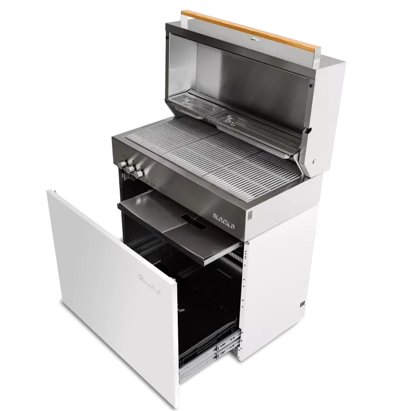 Die beiden entnehmbaren Edelstahlschubladen bilden die Basis des Ofendocks. Die darüber liegenden Roste sind einzeln einklappbar.