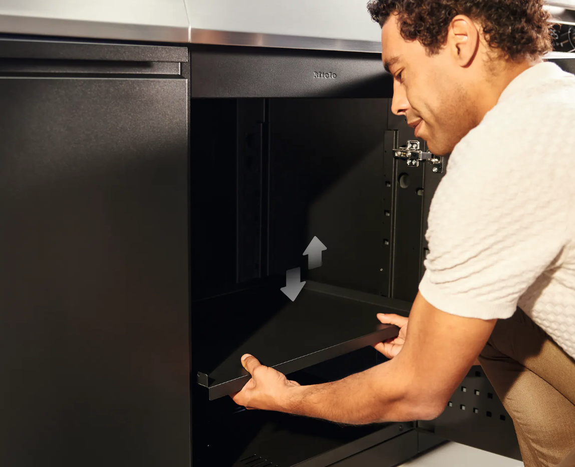 - Die individuell einstellbaren Einlegeböden bieten Platz für Zubehör und Geschirr bis zu 20 kg