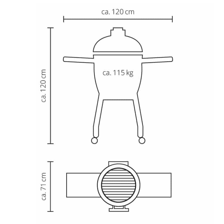 Im Serienumfang ausgestattet mit Metallrahmen, Ring, zwei Griffen, zwei Deflektorsteinen, zwei Tropfschalen und zwei Grillrosten, lässt es sich individuell erweitern.