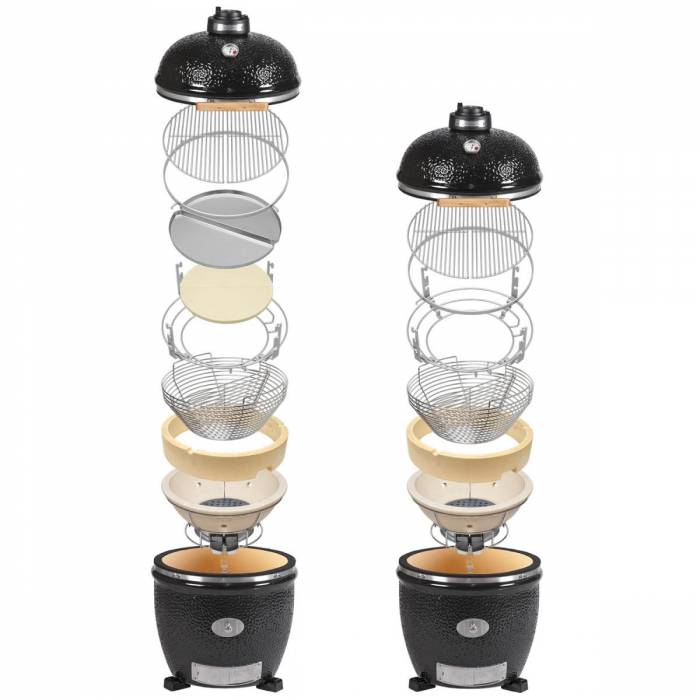 Im Serienumfang ausgestattet mit dem Metallrahmen, Ring und zwei griffen, zwei Deflektorsteinen, zwei Tropfschalen und zwei Grillrosten lässt es sich individuell erweitern.