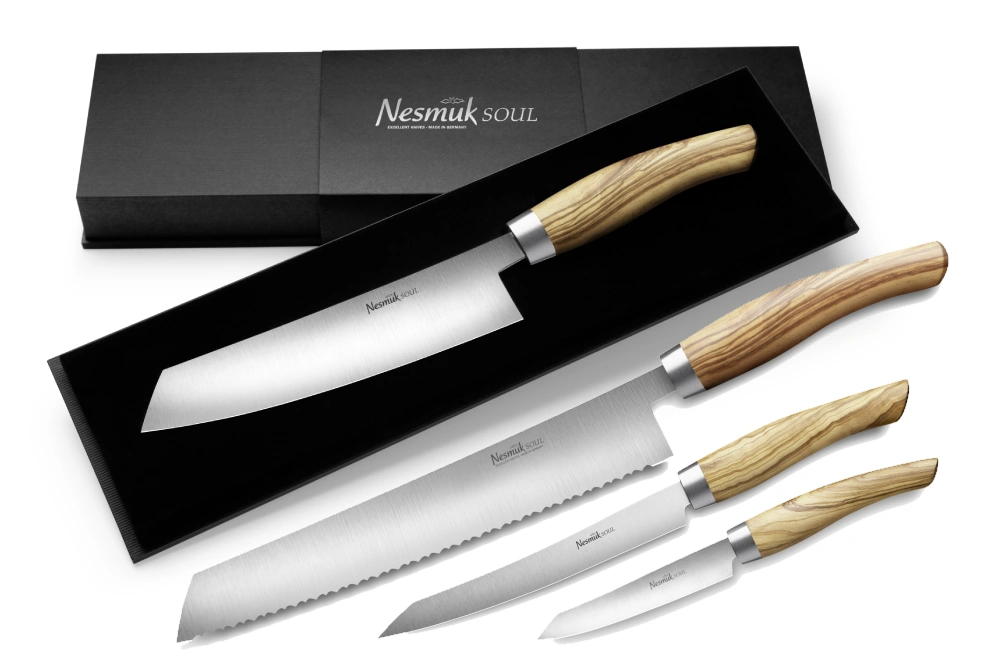 Produktinformationen "Nesmuk Soul Messerset - Kochmesser, Slicer, Office und Brotmesser Olivenholz"
