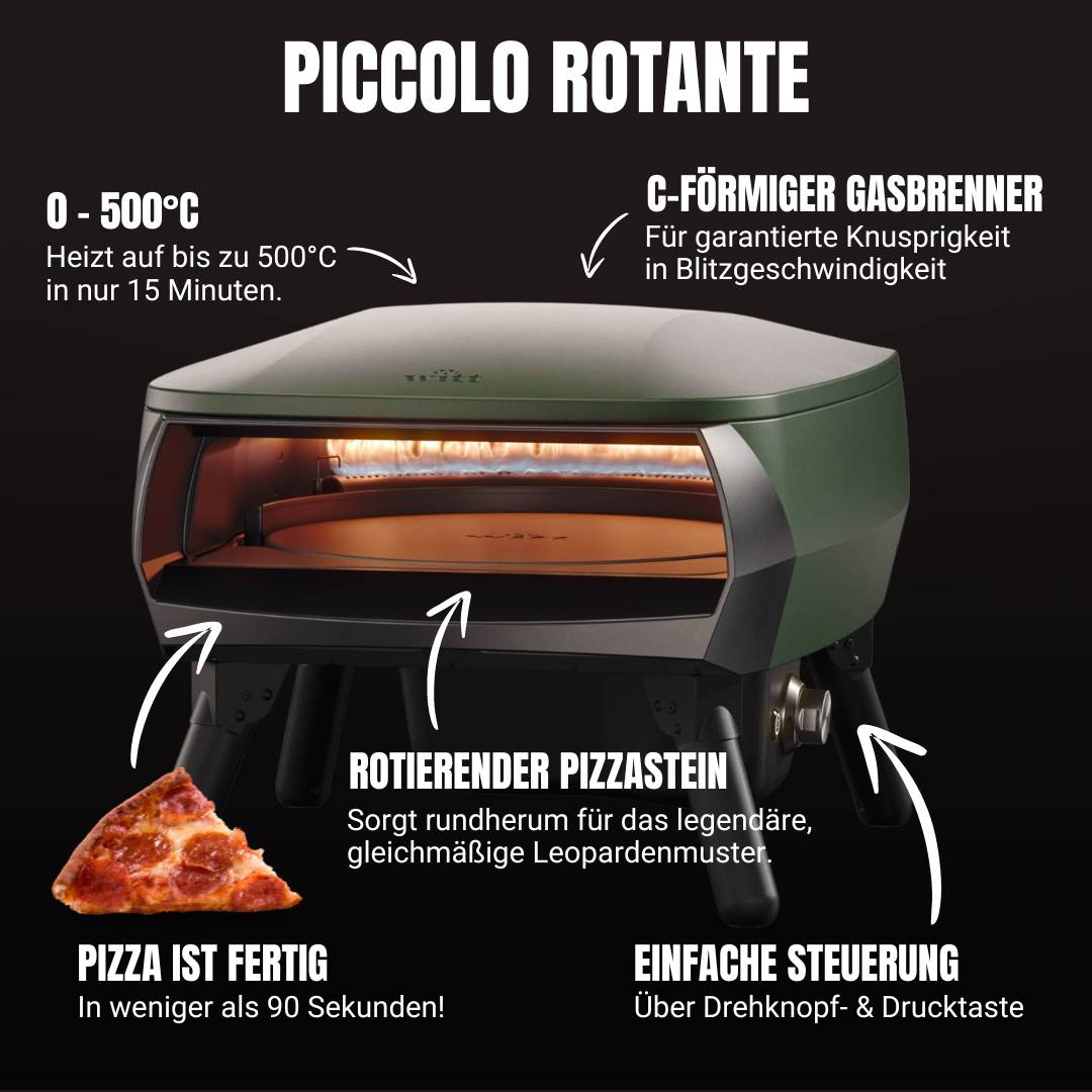 Der Witt Etna Piccolo ist in nur 15 - 20 Minuten bis auf 500°C aufgeheizt. Die Kombination aus dem C-förmigen Gasbrenner und dem rotierenden Stein lässt Dich Pizza um Pizza in Blitzgeschwindigkeit und mit garantierter Knusprigkeit backen.